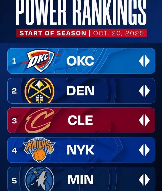 新赛季开赛在即,NBA官方公布的新赛季首期实力排行榜,卫冕冠军雷霆依旧高居第一。