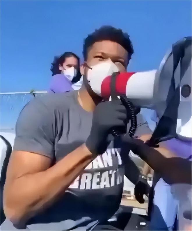 除了现场喊话表示支持之外,字母哥还跟队友们一起穿上了“我不能呼吸”的T恤,同时买了很多物资。