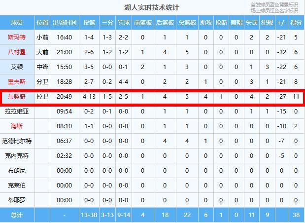 湖人:东契奇11分5板4助、里夫斯8分2板1助、八村塁6分5板、艾顿6分3板、斯玛特5分1板、海斯2分1板、范德比尔特4板1助、拉拉维亚1板